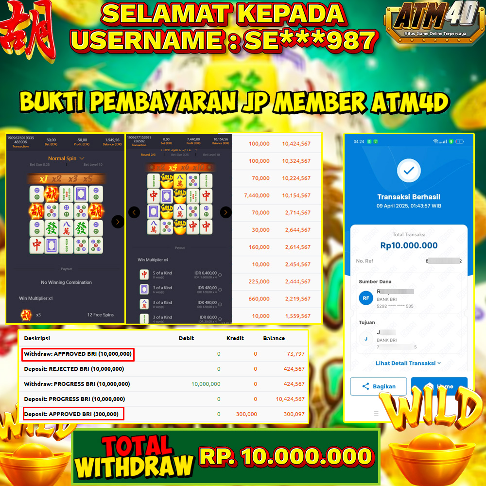 ATM4D JACKPOT SLOT MAHJONG WAYS 09 APRIL 2025, Bukti Kemenangan PG SOFT, Menang Platform online, Situs Aman Tergacor dan Aman, Withdraw Berapapun Pasti Di Bayar Langsung, Maxwin Slot Online.