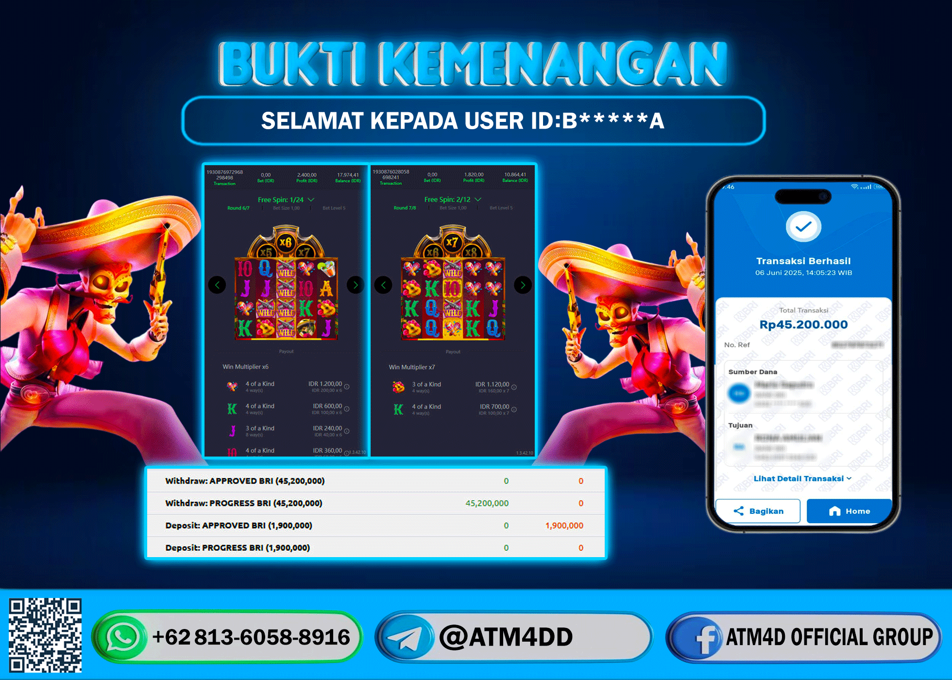 Jangan lewatkan kesempatan untuk meraih kemenangan besar. Daftar sekarang di ATM4D dan rasakan pengalaman bermain slot terbaik yang pernah ada! Putar gulungan, menangkan jackpot, dan jadilah bagian dari komunitas pemain sukses kami!