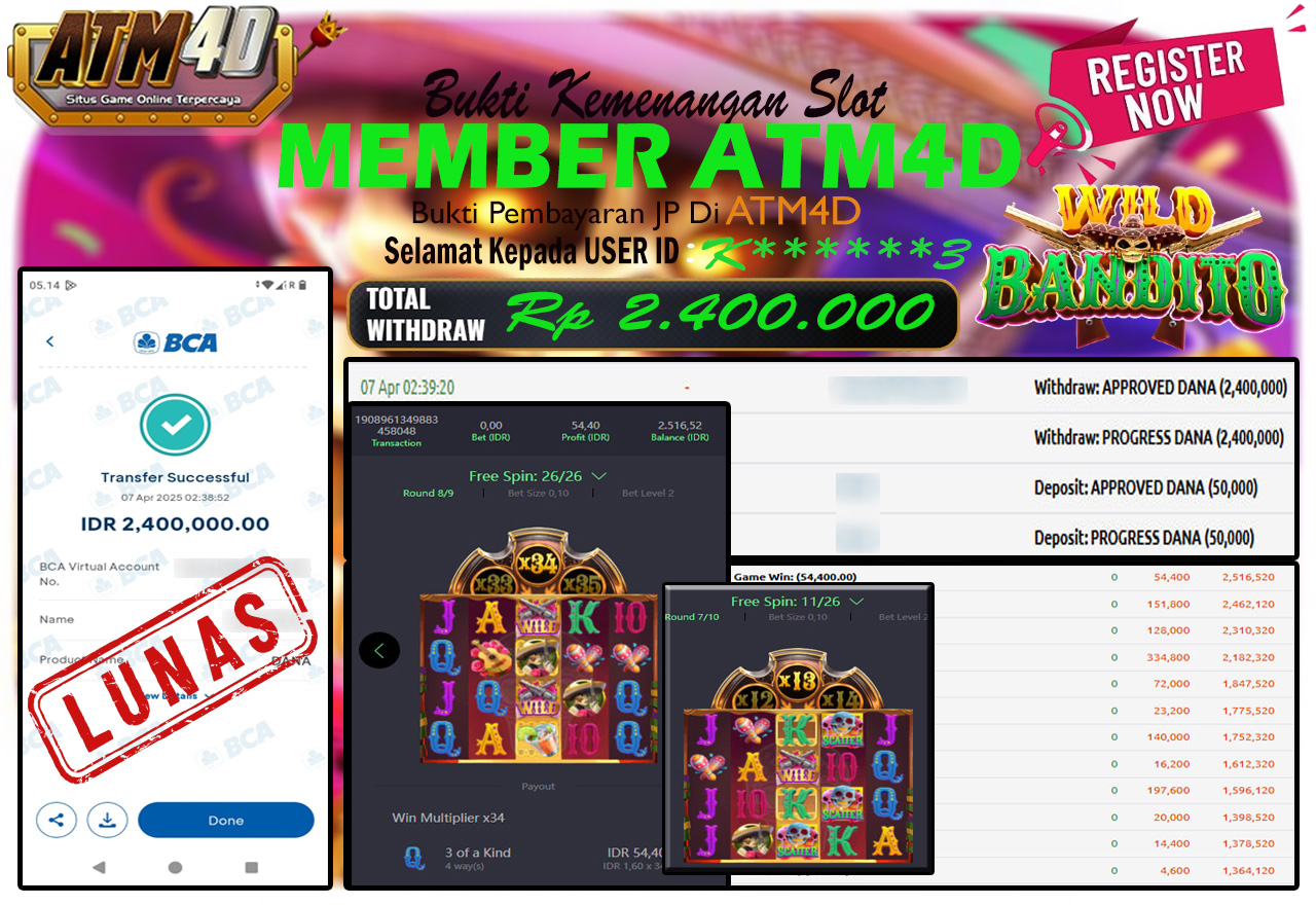 ATM4D – JACKPOT WILD BANDITO 07 APRIL 2025 Bukti Kemenangan , Kemenangan PG SOFT, Menang Platform online, Situs Aman Tergacor dan Aman, Withdraw Berapapun Pasti Di Bayar Langsung, Maxwin Slot Online.